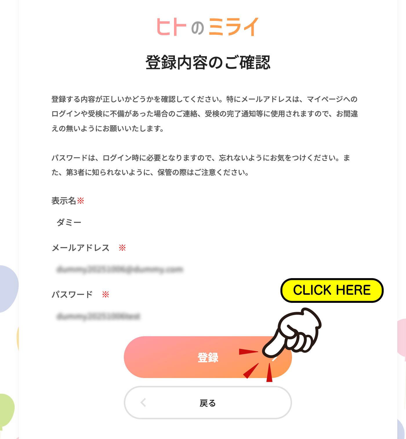 ここでは、ヒトのミライ上で表示する「表示名」およびログインで使用するメールアドレスとパスワードを設定してください。ここで必要な情報は以上です。 入力が終わりましたら、「確認へ」のボタンで進んでください。