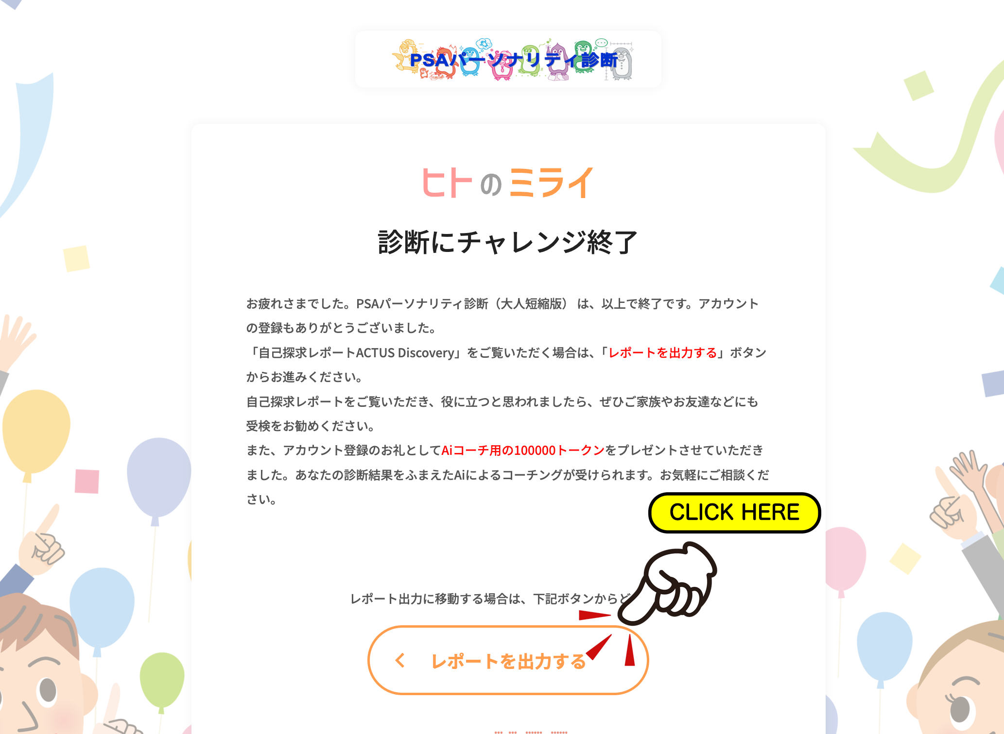 以上で、ヒトのミライの初期登録は終了です。「レポートを」出力」ボタンでレポート出力ページに進んでください。あなたのイメージをタップすると PSAパーソナリティ診断の自己探求レポートである「ACTUS Discovery」が出力できます。内容をご覧いただき、活用できそうであれば、ご家族やお友達 にお知らせください。