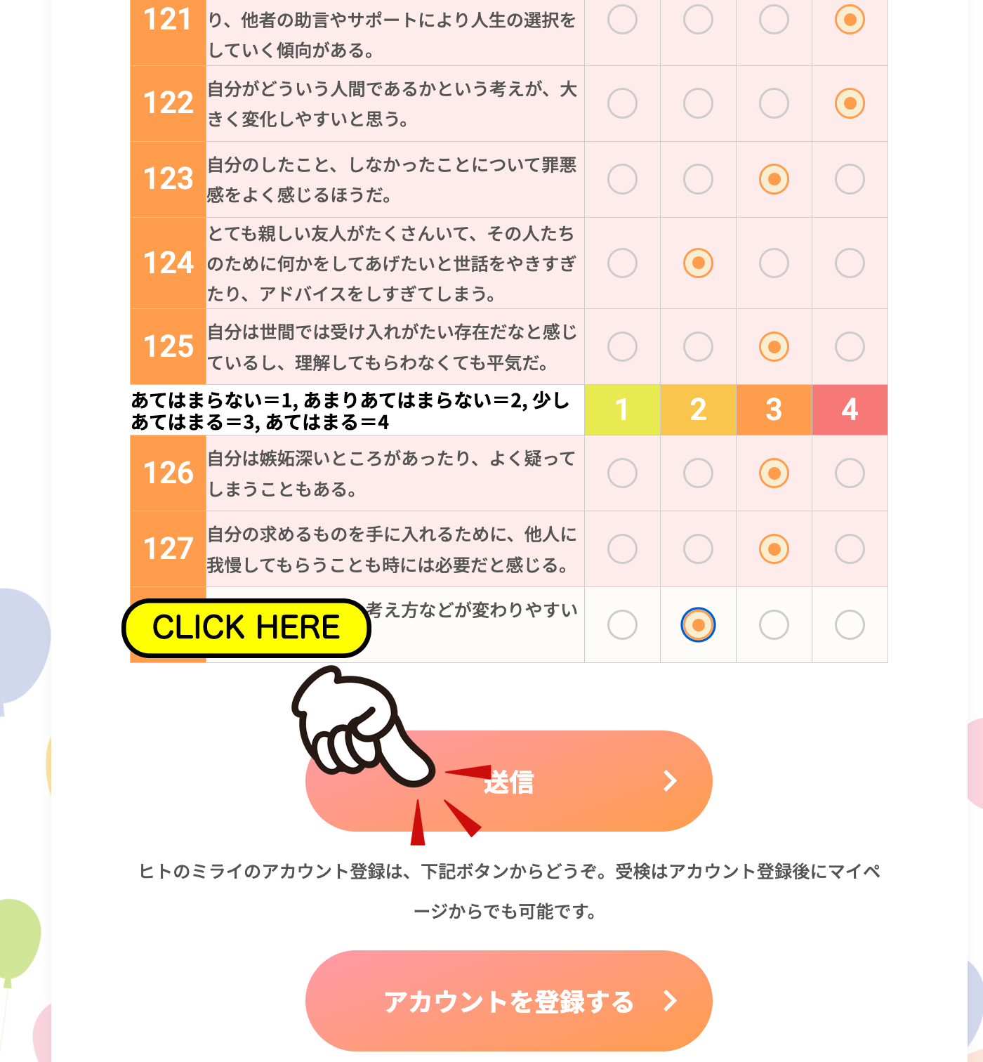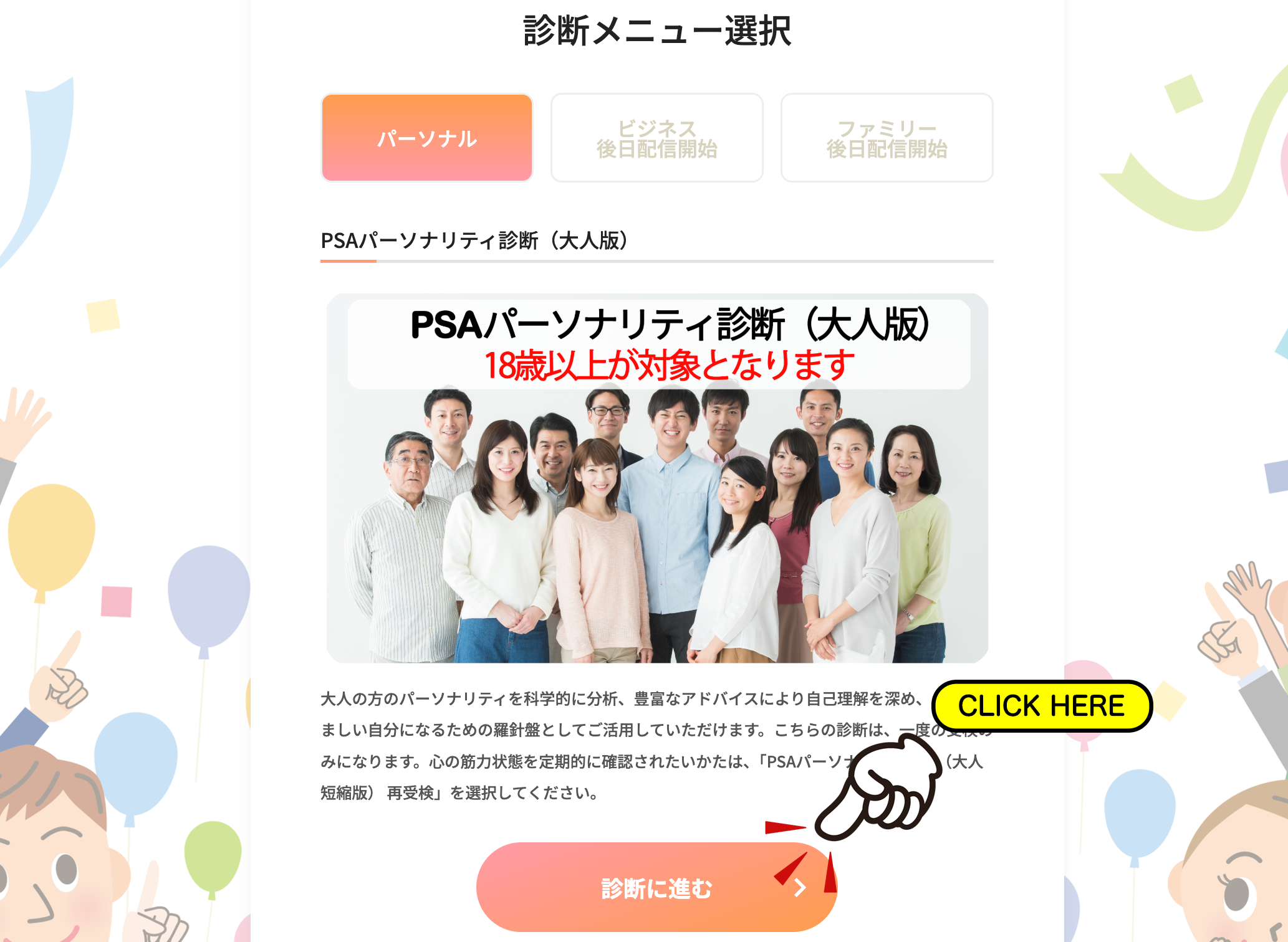 ここでは、管理者となる方にPSAパーソナリティ診断(大人版)を受検いただきます。子供版などは、アカウント登録後にマイページがから受検することができます。