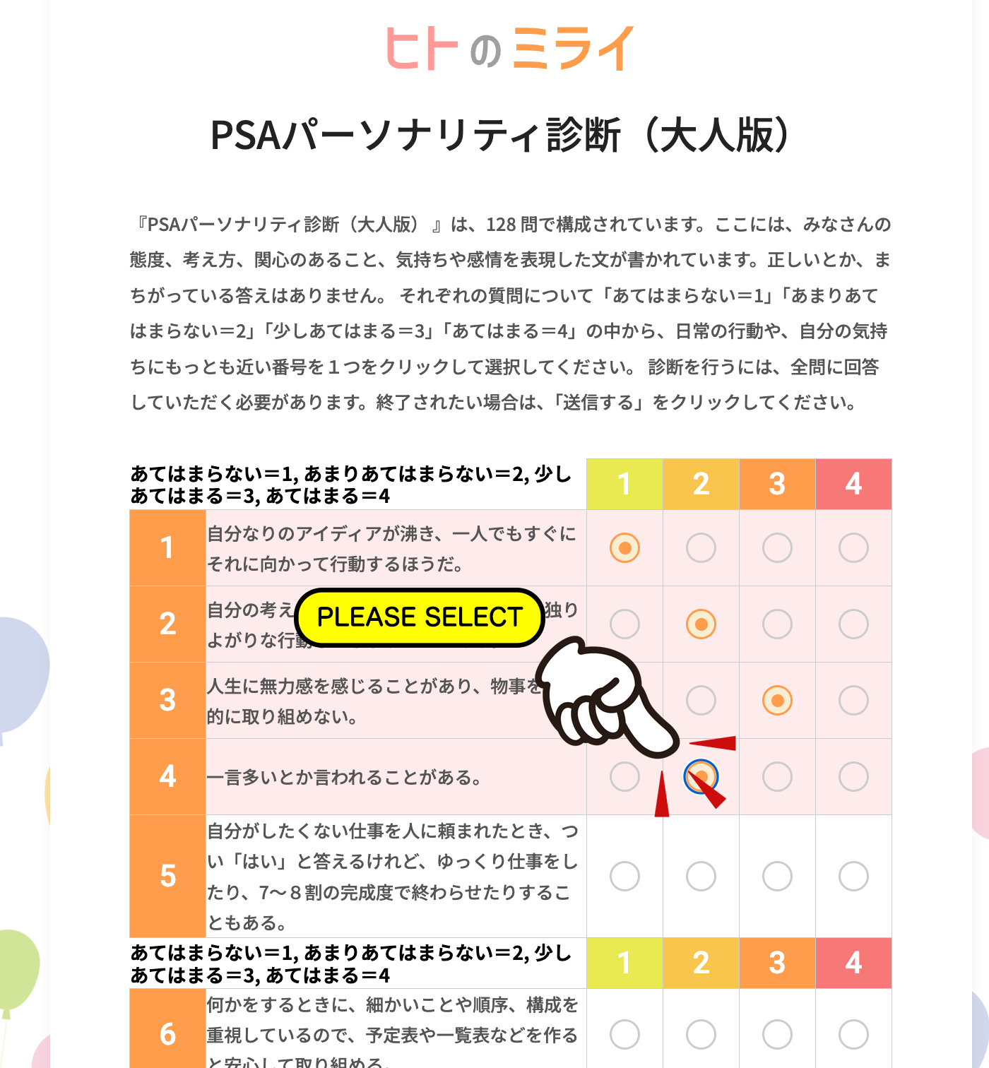 • ②PSAパーソナリティ診断(大人版)は、全部で128問あります。30分程度で回答できます。